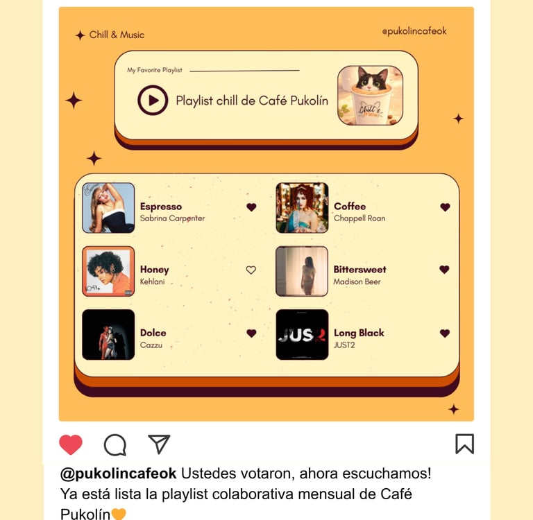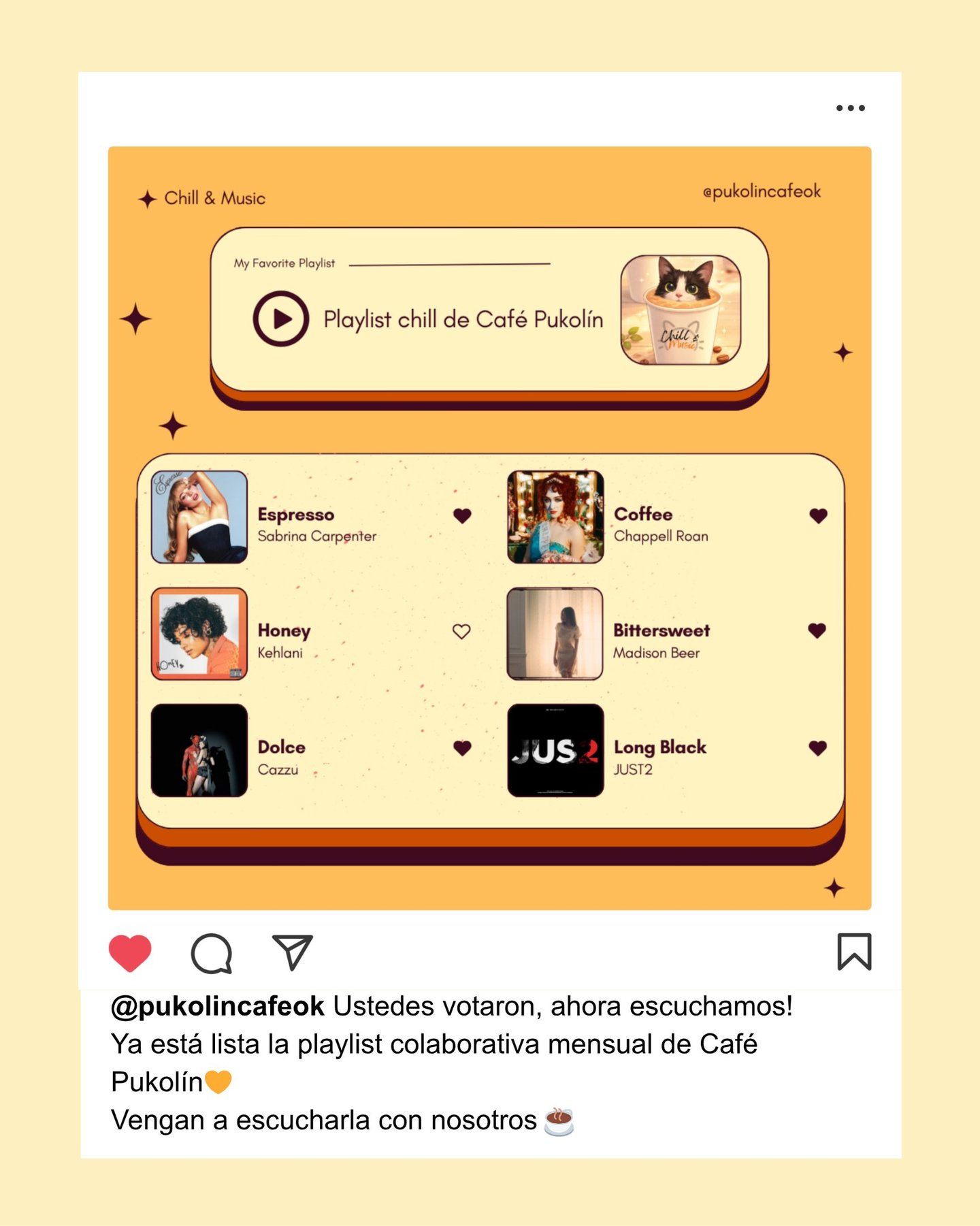 Pieza para anunciar la dinámica mensual de playlist, integrando identidad visual y participación de la comunidad.